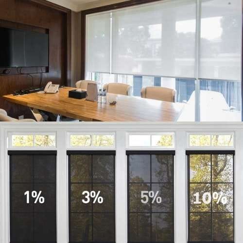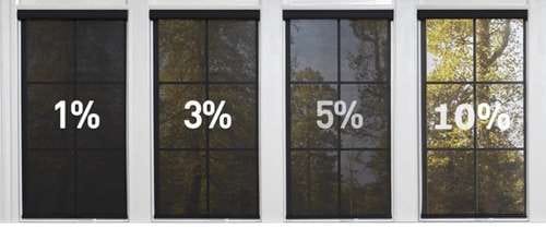 Ofrecemos diferentes tipos de apertura solar para tus cortinas roller screen, incluyendo opciones del 1%, 3%, 5% y 10%. Esto te permite elegir el nivel de opacidad que mejor se adapte a tus necesidades de privacidad y control de luz.